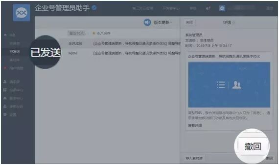8 已经发送的企业号消息能撤回吗? 可以撤回,支持所有图文消息和保密消息。【登录qy.weixin.qq.com➜已发送➜选择相应的应用➜找到需要撤回的消息➜撤回】。通过接口发送的消息,暂不支持撤回。